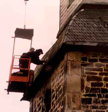 Alle 1950 durchgeführten Arbeiten hielten den Beanspruchungen von Wind und Wetter bis heute größtenteils Stand. 2001 waren dann aber Reparaturen notwendig um den Turm wieder regensicher zu machen. Bei diesen Arbeiten kamen im Gegensatz zu den Arbeiten 1905 und 1950 jedoch modernere Geräte, wie z.B. ein Autokran zum Einsatz. Das angewandte Handwerk zur Reparatur des Schieferdachs, ist jedoch identisch mit den Arbeitsablauf von 1905, denn altdeutsche Deckung von 1905 unterscheidet sich nicht von altdeutscher Deckung von 2001. |