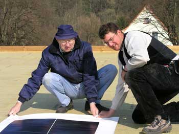 Im Bild sehen Sie unseren Vorarbeiter und Verantwortlichen für diese Baustelle Sascha Krone (links im Bild), der mit dem Fachverleger der Firma "Alwitra" (rechts im Bild) dem Hersteller der Solarbahnen, letzte Details klärt. Somit konnte die Solarbahn fachgerecht verlegt und angeschlossen werden. Eine geschlossene Abdichtung des gesamten Daches wird durch den Anschluss an die Dachränder mittels hochpolymerer Dachbahnen erreicht. |