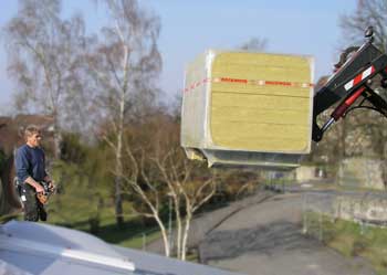 Die Wärmedämmung wurde mit unserem Telestapler über den First, auf die Südseite des Daches transportiert und dort direkt von der Transportpalette abgenommen und verlegt. Dies spart Zeit und somit Kosten für den Kunden und verhindert eine Beschädigung der Dämmstoffplatten beim Transport auf das Dach. Links sehen Sie Peter Queckbörner, der als einer der Spezialisten im Umgang mit dem Telestapler, die Wärmedämmung mittels Fernbedienung auf das Dach hebt. |