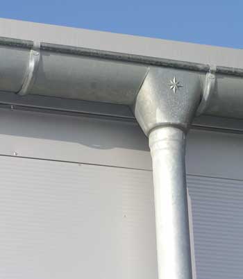 | Dachrinnen, Einhangstutzen und Fallrohre aus Titanzink. Die Führung des Fallrohres an die Wand ist in den verschiedensten Verläufen möglich, Gerade oder eckig, wie oben zu sehen. Es gibt aber auch die Möglichkeit von runden Formen bis hin zum Gliederbogen oder Schwanenhals. |
