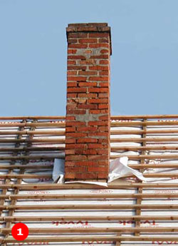 Die nebenstehenden Bilder zeigen die Sanierung eines Schornsteins mittels Fertigelementen. Der alte Schornstein (Bild 1) wird abgerissen und fachgerecht entsorgt. Dann erfolgt die Neuerstellung mittels Fertigelementen vom Dachboden aus (Bild 2). Diese werden bis auf die Höhe des alten Schornsteins geführt. Auf diese Weise kann natürlich jeder Schornstein in seiner gesamten Länge saniert werden, falls dies notwendig ist. |