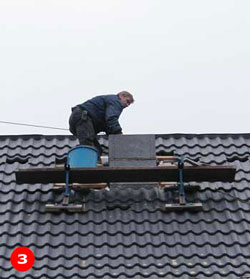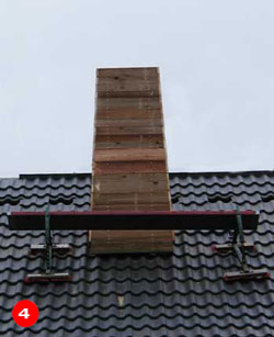 Bild 3 zeigt den neuen Schornstein kurz vor erreichen der entgültigen Höhe. Anschließend wird der neue Schornstein mit Holz verschalt und nachfolgend mit Faserzementplatten oder Metallprofilen verkleidet. Der Schornstein bietet durch seine wärmeisolierende Verkleidung optimalen "Zug" und gefährdet niemanden mehr, durch eventuell herunterfallende Ziegelsteine.