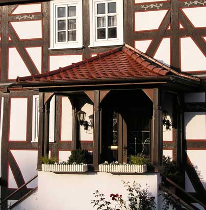 Vordach in Obermöllrich Vordächer schützen dauerhaft Haustür und Eingangsbereich vor Wind und Wetter. Das links gezeigte Vordach eines Fachwerkhauses in Obermöllrich, ist mit Biberschwanzziegeln in Doppeldeckung gedeckt. Im Gegensatz zum Hauptdach, welches mit Walther W4 Flachdachpfannen (Brilianz Marone) eingedeckt ist, finden beim Vordach Biberschwanzziegeln des gleichen Herstellers Verwendung, um bei der kleinen Dachfläche eine bessere Flächenwirkung zu erzielen. |