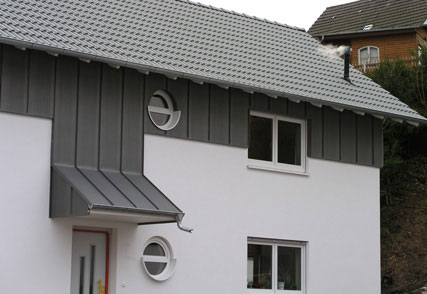 Vordach in Melsungen Das Vordach in Doppelstehfalztechnik aus vorbewittertem Titanzink, integriert sich sehr gut in die Fassade des Wohnhauses. Die Schare des Vordaches wurden in einem Stück gefertigt, um das Vordach ohne störende Anschlüsse an die Fassade anzubinden. Für die Fassade wurde ein dunkles Titanzink ausgewählt, um es farblich an das Hauptdach optimal anzupassen. |